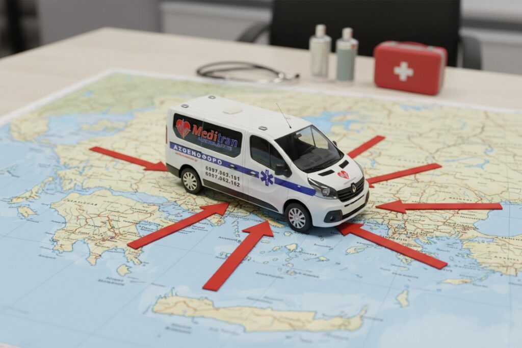 Η Meditran Ambulance καλύπτει γεωγραφικά όλη την Ελλάδα. Η ομάδα μας αναλαμβάνει με πλήρη υπευθυνότητα και υψηλό επαγγελματισμό την ασφαλή μεταφορά ασθενούς από και προς όλους τους νομούς της Ελλάδας, ακόμη και στις πιο απομακρυσμένες ηπειρωτικές ή νησιωτικές περιοχές. Κατά την καλοκαιρινή περίοδο, η εταιρεία μας δίνει ιδιαίτερη έμφαση στις τουριστικές περιοχές της χώρας μας όπως π.χ. Χαλκιδική, Πιερία, Καβάλα, νησιά κ.α. στις οποίες παρατηρείται αύξηση πληθυσμού λόγω του τουρισμού. Για το λόγο αυτό παρέχει υπηρεσίες σε τουριστικά γραφεία, εξασφαλίζοντας τη μεταφορά των τουριστών σε κεντρικά νοσηλευτικά ιδρύματα (δημόσια ή ιδιωτικά) για οποιοδήποτε πρόβλημα υγείας.